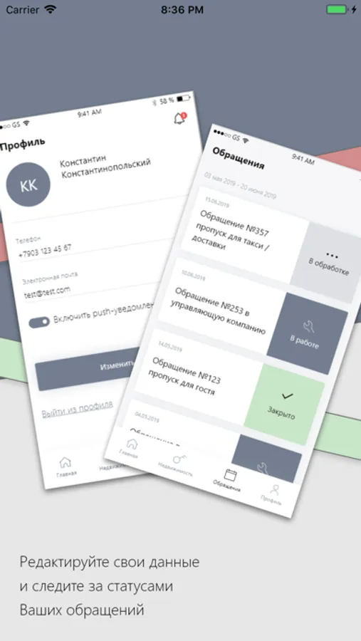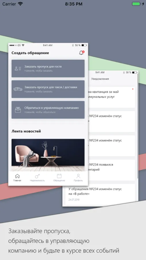 • оформлять пропуска и обращения в управляющую компанию и следить за их статусами;
