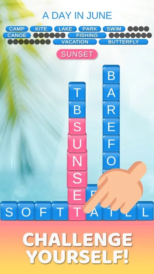 Swipe to reveal hidden words crashing word stacks down to win! Easy at first, but gets challenging quickly. Can you beat the game?