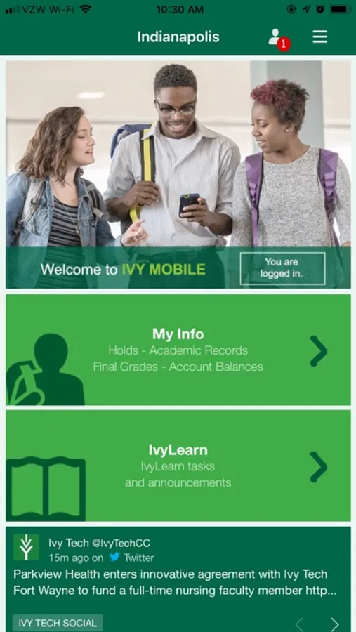 IvyMobile puts important Ivy Tech Community College information in your pocket. You’ll see details based on your class schedule, your professors, college deadlines and holidays, financial aid, campus buildings, bookstores, places to eat, and more. We want you to succeed as an Ivy Tech student, and the first step is making sure you not only know your way around, but also what’s happening in your classes. If IvyMobile could be more helpful, feel free to leave us in-app feedback for future updates.