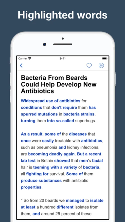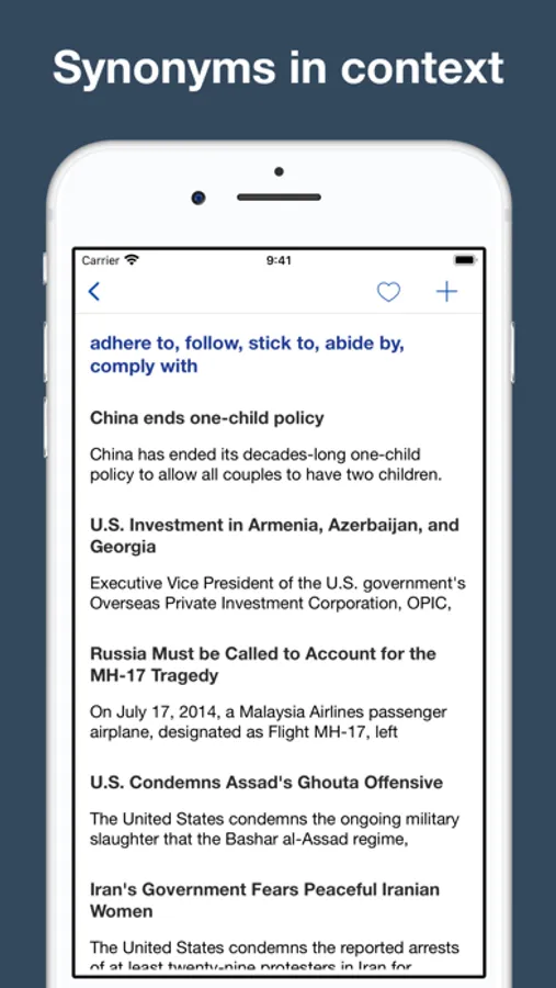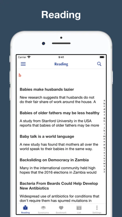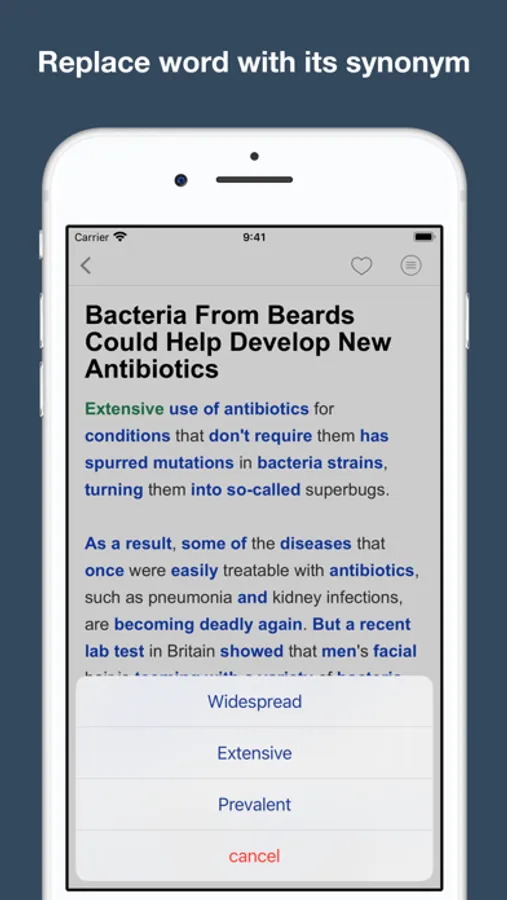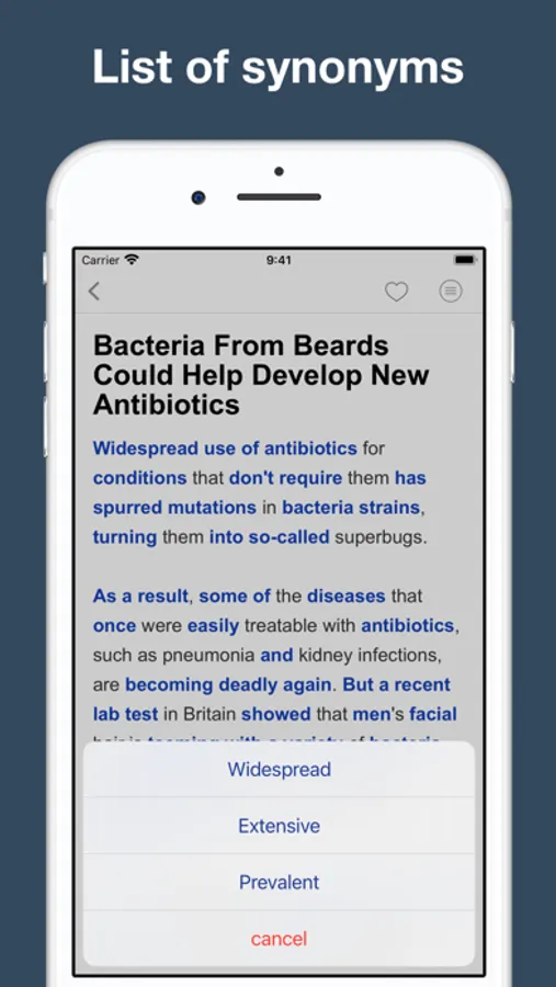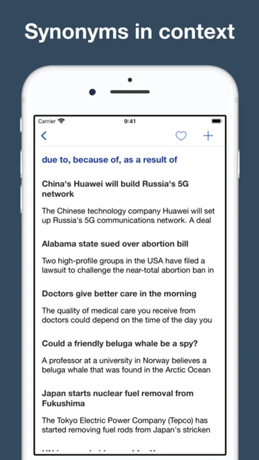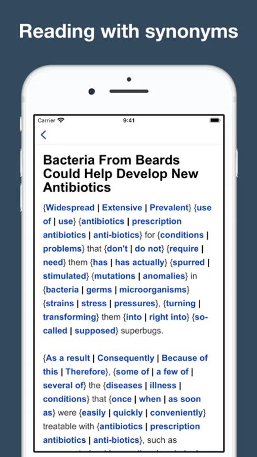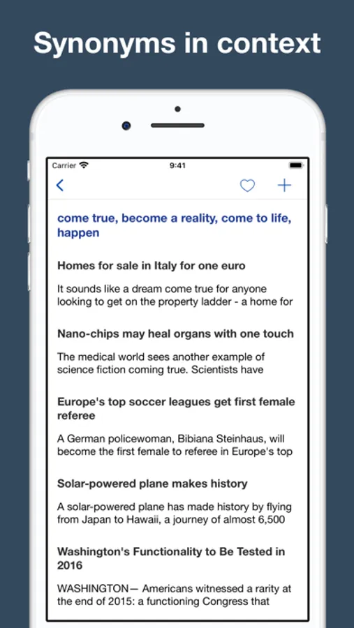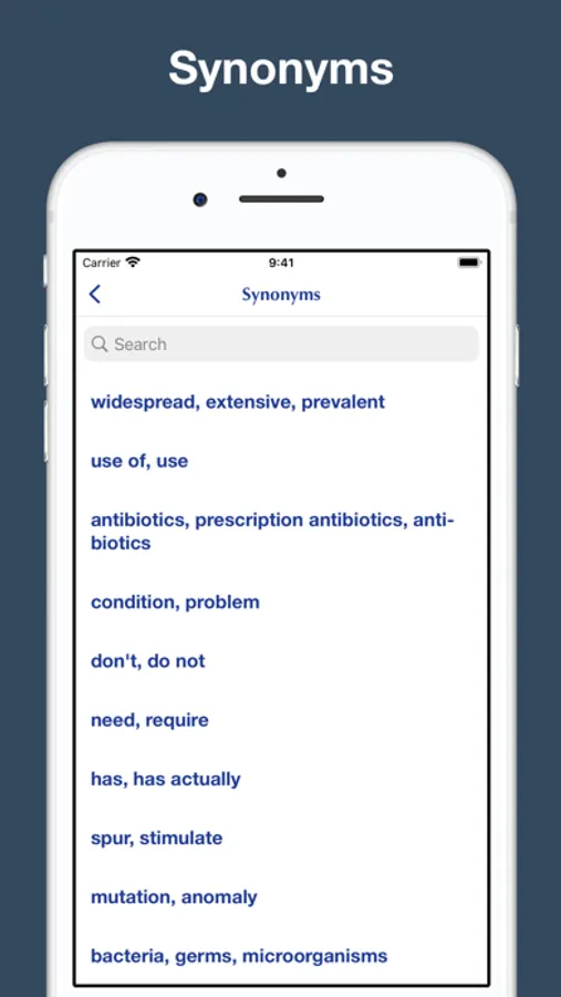 This app provides reading materials and tools for you to learn English synonyms. The most efficient way to learn synonyms is to learn them in context.