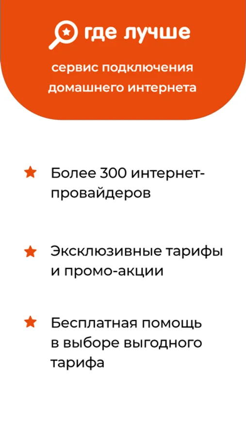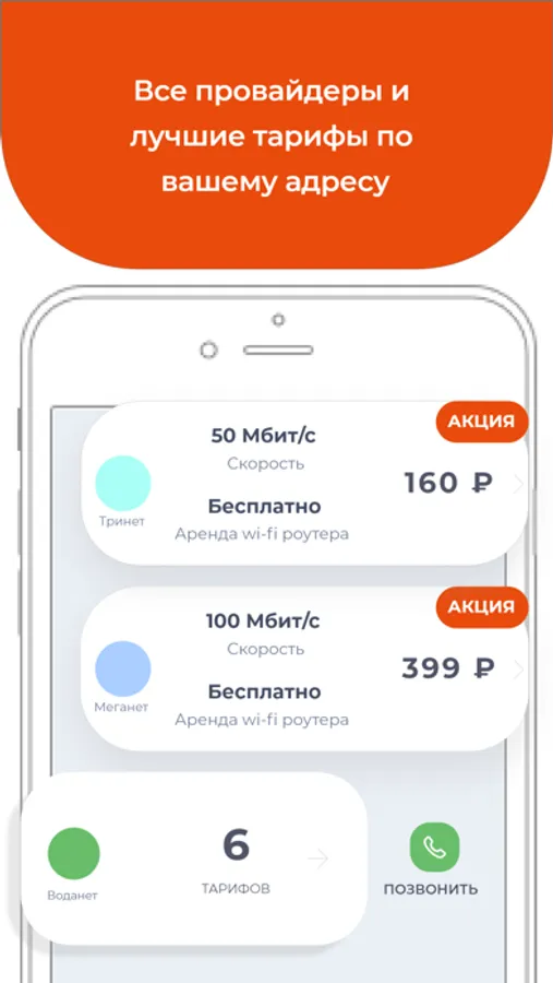 В приложение представлены все тарифы провайдеров, включая эксклюзивные, а также акционные тарифные планы. Сравнивайте и выбирайте лучшее предложении от более 300 интернет-провайдеров.