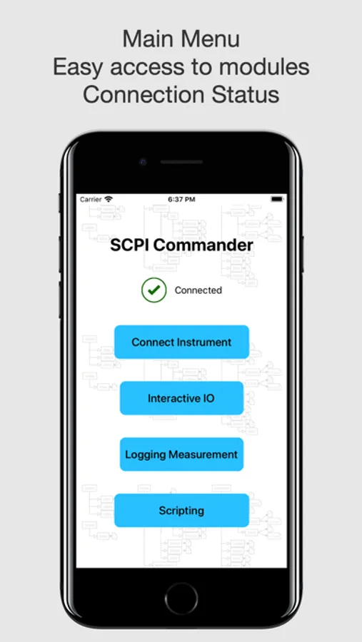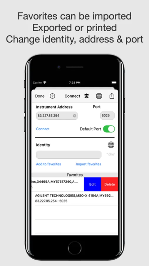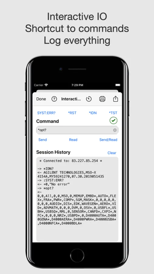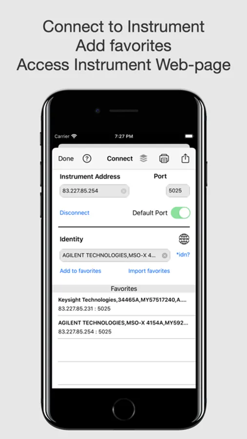 This app will connect to any LXI enabled instrument. You can control and get data back using for example SCPI (Standard Commands for Programmable Instruments) or any other kind of commands that can be send as plain ASCII over socket.
