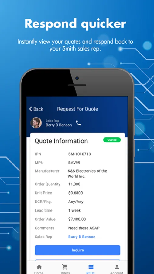 The Smith app allows you to instantly access details and records – like invoices, quality reports, and tracking information – on orders you’ve placed with us. You can also use the app to easily contact your Smith sales rep.