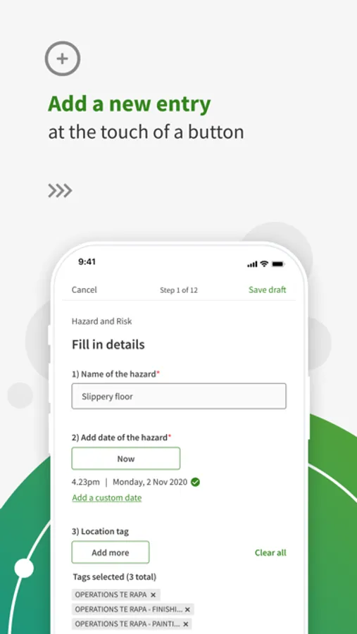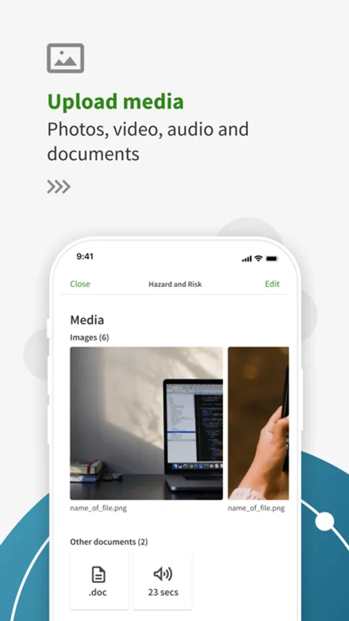 - Capture and share relevant photos, videos and audio enriching the reporting of hazard and risk events.