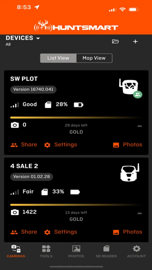 Connect all your cameras, old and new, different makes and models* using HuntSmart™. Position your cameras’ locations on a map and better track the game movement on your property. Photos contain essential weather data, logging wind, temperature, barometric pressure and moon phase. Tag photos with custom descriptions and searchable gallery contents. Sort and filter by date, time of day, weather, location, moon phase, species and more! You can even set up a family and friend’s network to view and manage photos. Everything you need in a hunting app; the big bucks won’t stand a chance.
