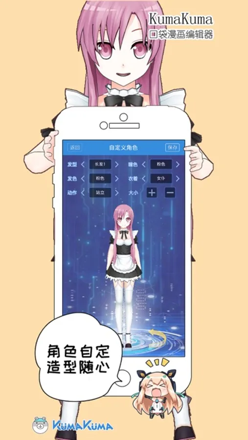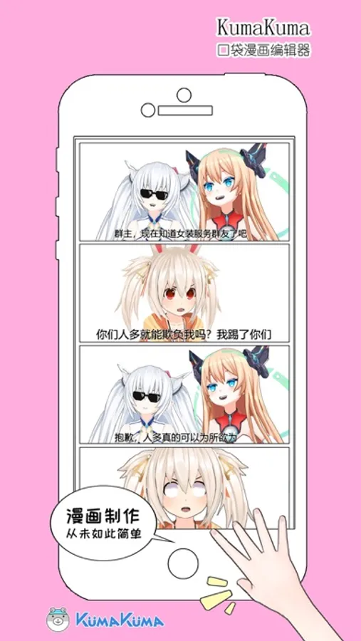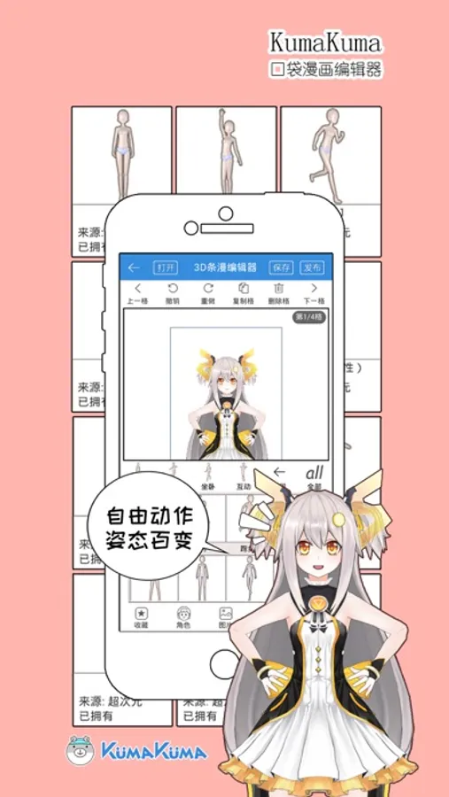 《KumaKuma口袋漫画编辑器》是移动版的本子编辑器,是一款以3D模型为基础制作的漫画编辑器,可以快速制作AR单张趣图或四格条漫,我们的目的是让所有人都能体会到制作漫画的乐趣(°∀°)ノ