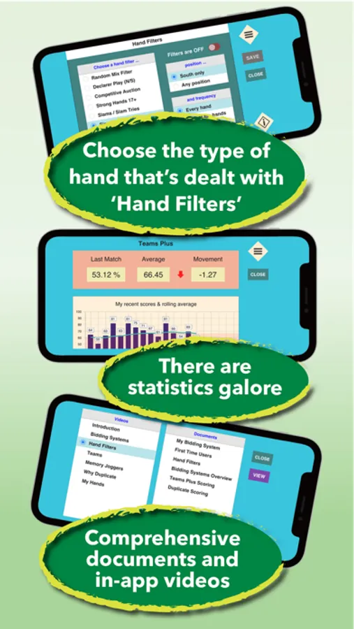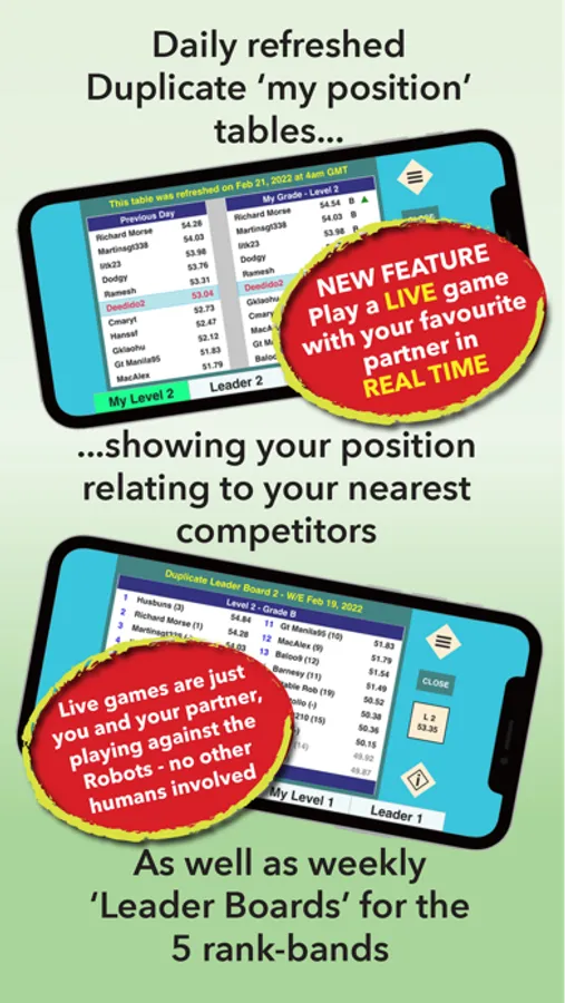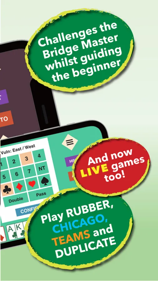• Play Rubber, Chicago, Teams or Duplicate * and now PLAY LIVE in REAL TIME with your chosen partner