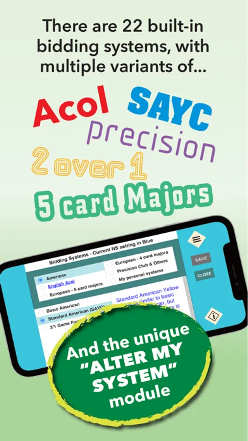 • Select from one of the 22 built-in bidding systems, from the most basic to the highly complex and technical