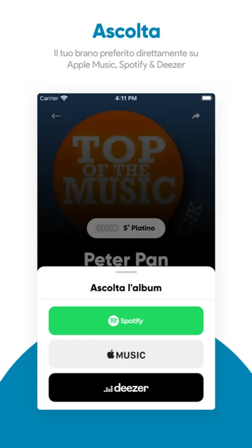 - Riproduzione diretta di album o singoli attraverso le principali piattaforme di streaming (Apple Music, Spotify e Deezer)