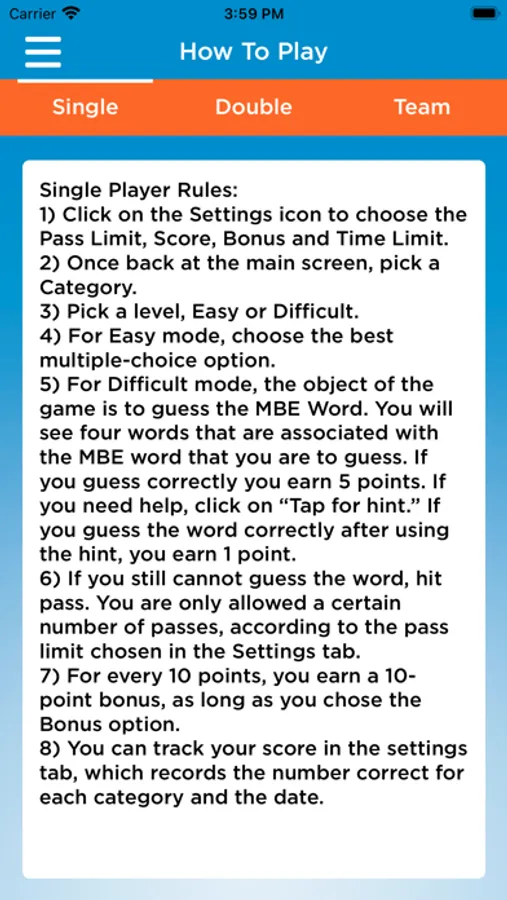 First choose the Single, Double or Team Player option. When in single player mode, you can chose between a multiple choice easy option or opt for more challenging fill-in the blank style questions. With the difficult option, you will see four words associated with an MBE word that you are to guess. If you guess the correct word, you earn 5 points. If you need help, click on “Tap for hint.” If you need to pass, you can pass according to the limits set up in the Settings tab. If you get an answer wrong, the next word pops up. Regardless of whether you guess the word correctly or not, the answer and full definition including all the elements will pop up. The game will pause during this time so you can read and take notes as needed. For every 10 points, you earn an additional 10-point bonus. You can track your score in the settings tab and see how you compare to others in the Leaderboard.
