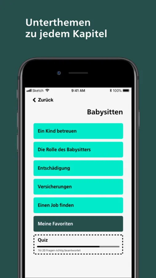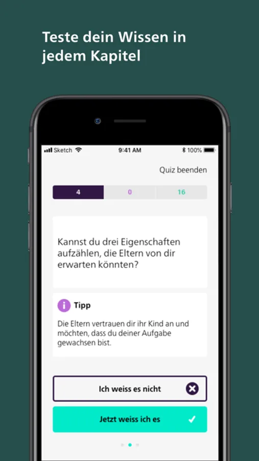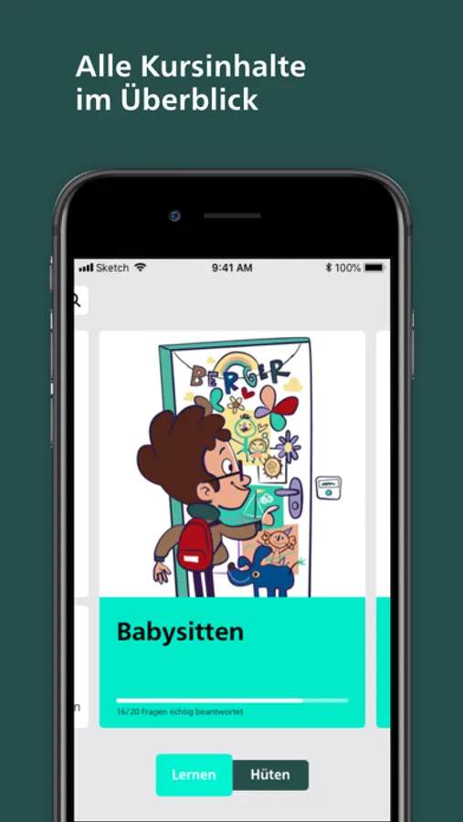 Du lernst wichtige Fakten zum Babysitting mit fachlich abgesicherten Infotexten, Videos, Animationen, Grafiken und Fotos. Der Bereich „Hüten“ hilft dir, den Überblick über deine Hüteaufgaben zu behalten.