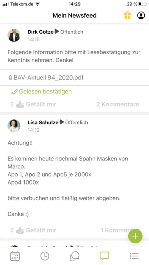 Mein Newsfeed: Dasselbe gilt natürlich für den Newsfeed. Informieren Sie Ihre Kollegen in der Apotheke einfach, indem Sie einen Beitrag im Newsfeed schreiben und diesen auf das Smartboard in der Apotheke bringen. Lesebestätigung nötig? Kein Problem mit der PULSE Team App!