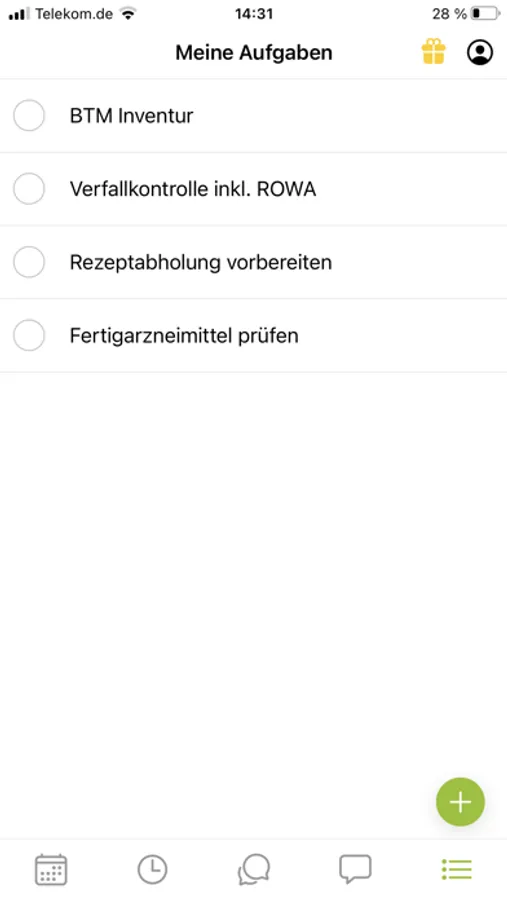 Meine Aufgaben: Lassen Sie sich auf einen Blick alle offenen und erledigten Aufgaben anzeigen. Ihnen fällt unterwegs ein, dass in der Apotheke dringend eine Aufgabe erledigt werden muss? Sie können über die App einfach Aufgaben erstellen und auf das Smartboard in Ihrer Apotheke bringen. So wissen alle Kollegen sofort über die neue Aufgabe Bescheid!
