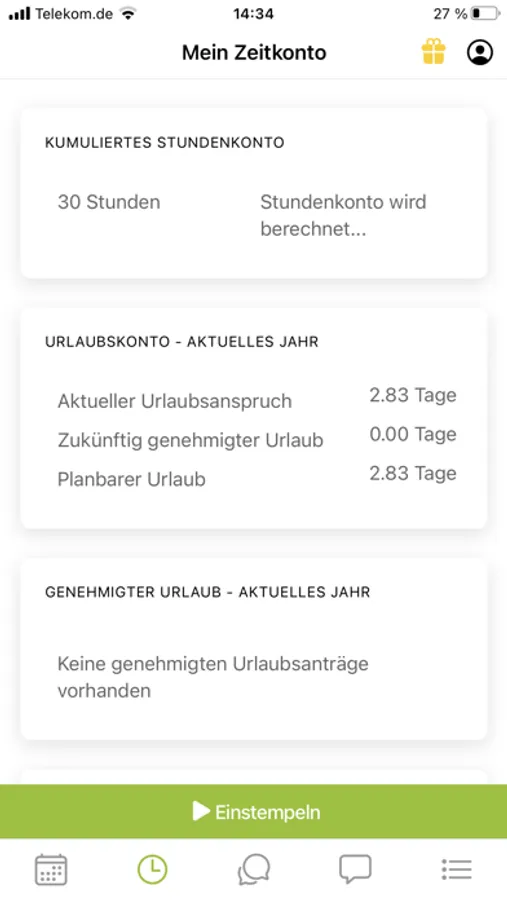 Mein Zeitkonto: Hier können Sie wichtige Informationen zu Ihren Überstunden, Ihrem Urlaubskonto inkl. genehmigter Urlaube, sowie den heutigen gestempelten Arbeitszeiteinträgen abrufen.