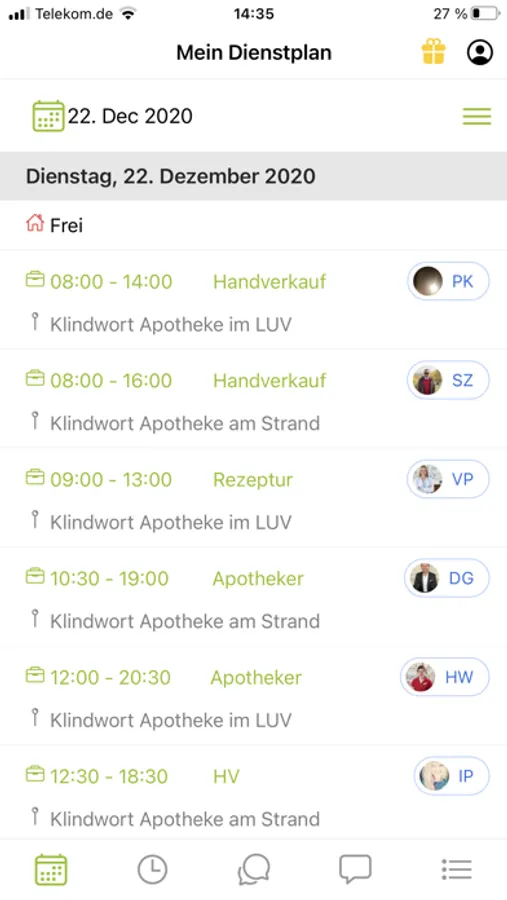Mein Dienstplan: Lassen Sie sich Ihre Arbeitszeiten und Abwesenheiten, sowie die Ihrer Kollegen anzeigen. Sie wollen abends auf dem Sofa wissen, mit wem Sie morgen arbeiten? Kein Problem!
