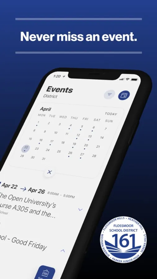 The event section shows a list of events throughout the district. Users can add an event to their calendar to share the event with friends and family with one tap.