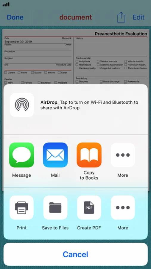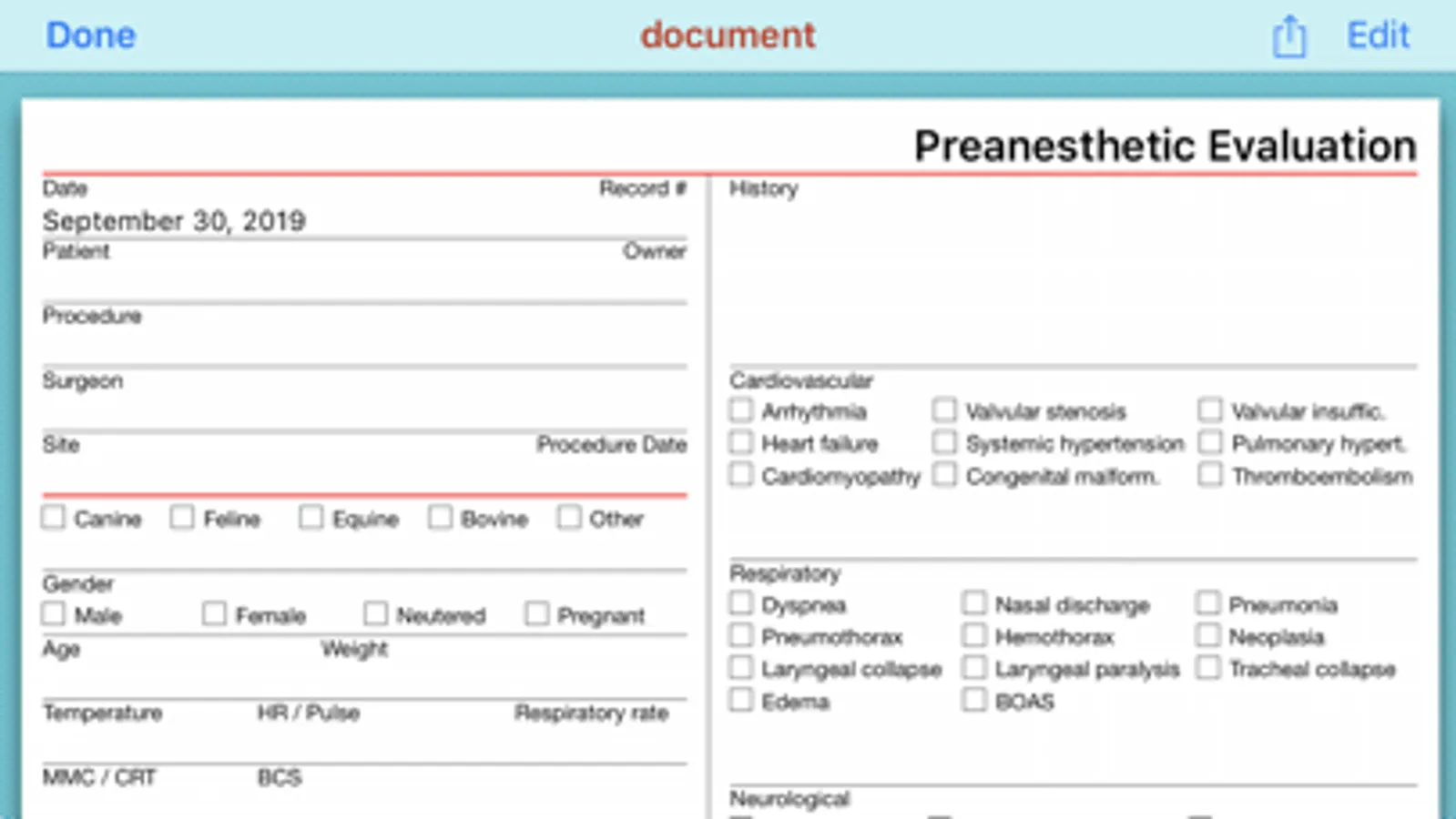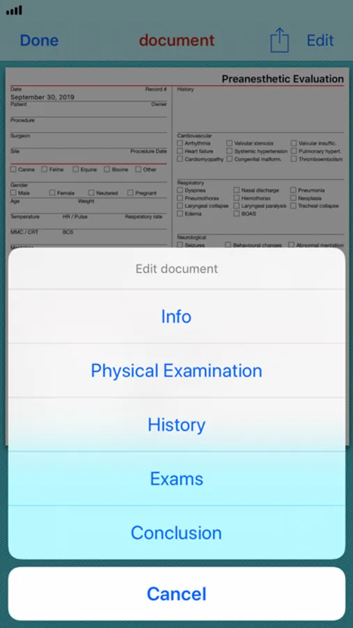 The app allows veterinary anaesthetists to fill out the Preanesthetic Evaluation. The collected information is stored in a PDF file that can be printed, saved, shared or exported.
