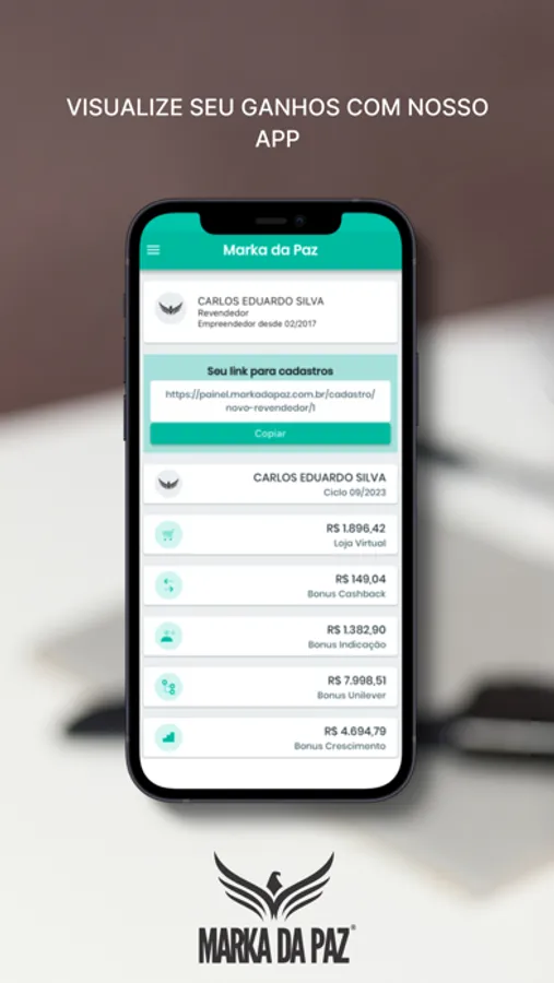 Aplicativo para revendedores Marka da Paz para acompanhamento de pontuação e bônus.