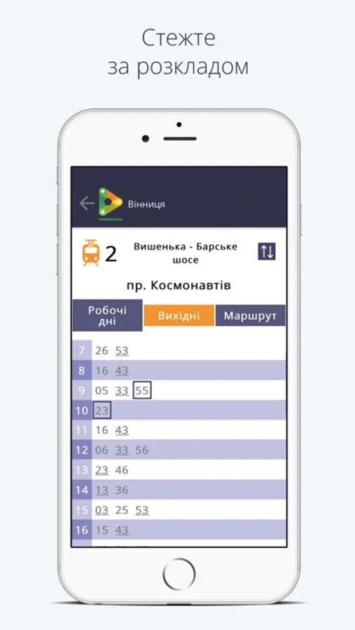 rozklad.in.ua - це додаток, який містить розклад руху та маршрути громадського транспорту у великих і малих містах, зокрема: Київ, Бровари, Вінниця, Житомир, Івано-Франківськ, Кременчук та інші. Він містить розклад руху на тиждень, зупинки на маршрутах, а також відстані до них у хвилинах. Допоможе спланувати час поїздки і зорієнтуватись у незнайомому місті.