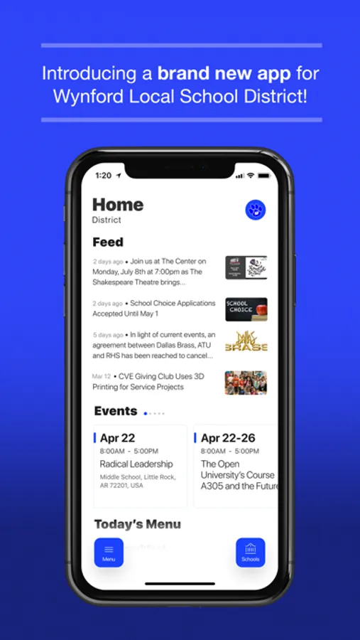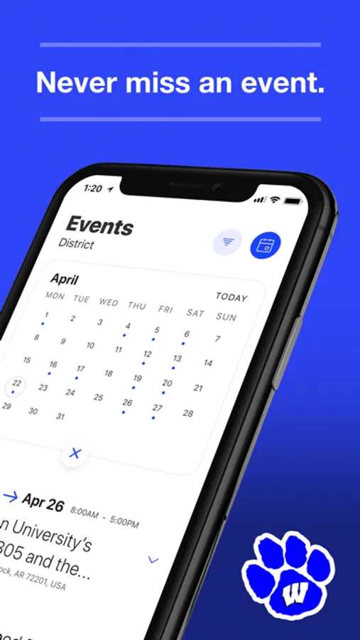 The event section shows a list of events throughout the district. Users can add an event to your calendar to share the event with friends and family with one tap.