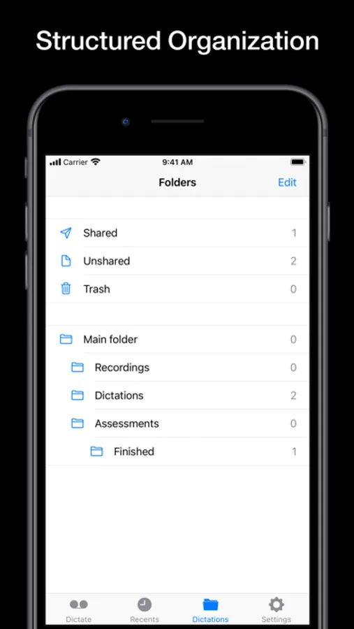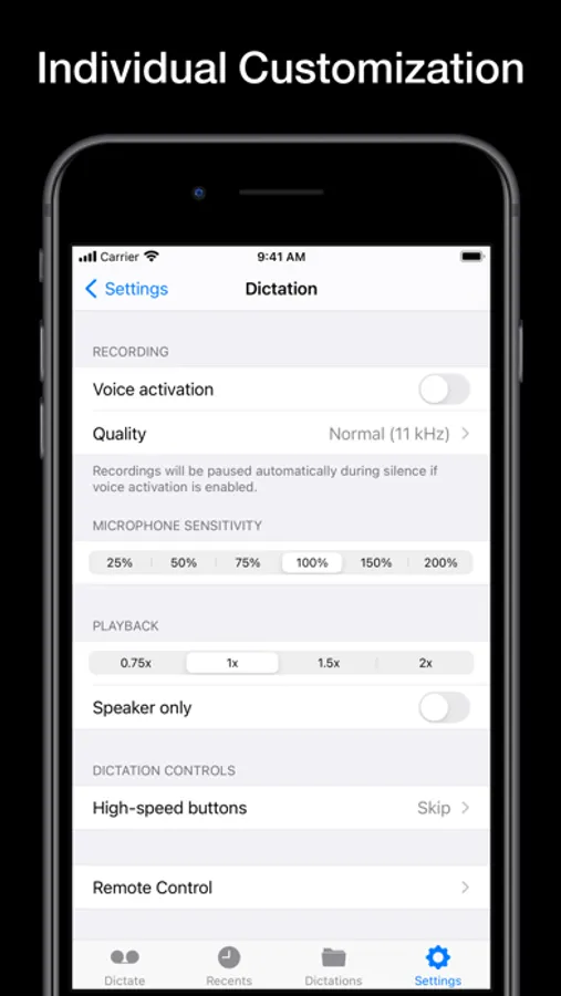 Dictate⁺ offers all functionality in the free version, only the length of each individual dictation is limited to 30 seconds. Our "feature unlock" subscription raises this limit to 24 hours at recording quality "Normal" (5 hours at quality "Studio").