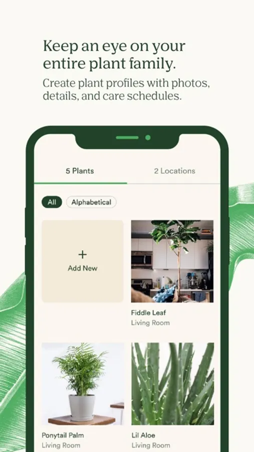 View your plant collection in one place, and create profiles for each leafy friend, with their name, adoption date, and photos you take. Log your plant care activities over time and watch your jungle thrive.