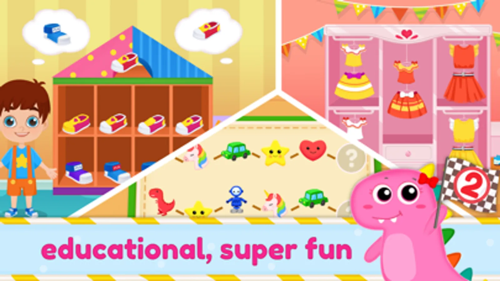 15 logic games for kids 4-7 to learn simple mathematics, exercise logical thinking, develop math sense, pay attention to details. Enjoy this app with dinosuar Coco and dinosaur Rex. Play matching game, math game, shape game, spot it game, pattern sequence game, car racing game, counting game, sorting game and more.