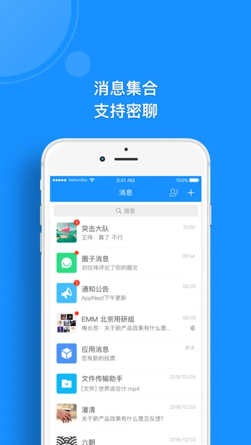 - 企业IM:丰富的会话形式,支持密聊、高管模式单向IM