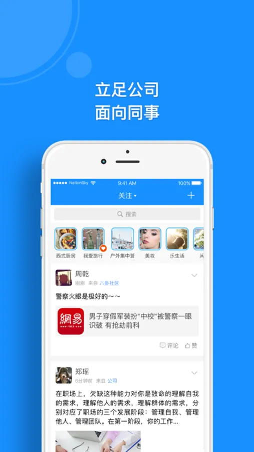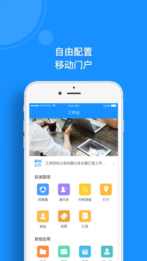 - 工作台:轮播图、公告消息、移动OA轻应用、订阅号新闻