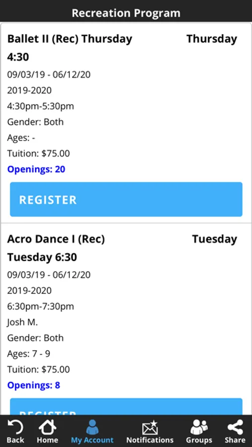 - Have a class in mind? Search by program, level, day, and time. You can register or even put yourself on a wait list.