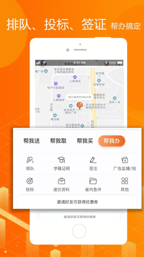 帮我办:如:医院挂号、餐厅排队、代购车票、照顾宠物、维修服务等,为客户提供高品质的各种上门服务。