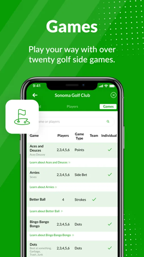 Add some fun to your round with an extensive library of on course golf betting games. All games include the most popular variations and have their own scorecards to view the game's full details. The app is extremely flexible to allow for score corrections, starting in any hole, skip holes, adding/deleting players or games in the middle of the round, add presses to old holes, etc. Best eraser ever.