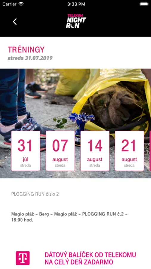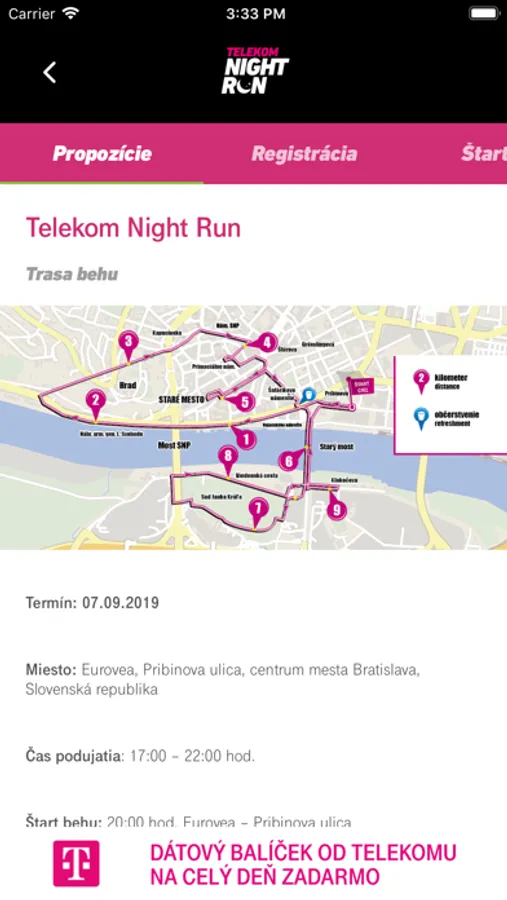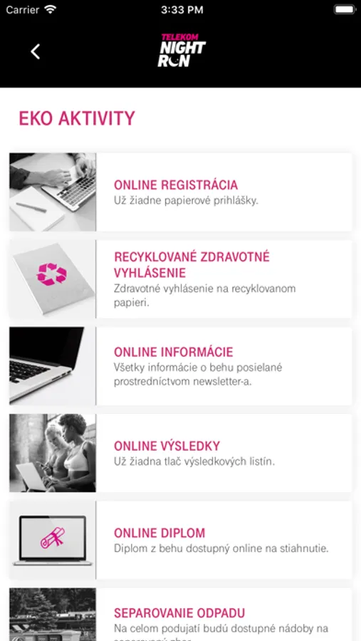 Táto aplikácia poskytuje všetky základné informácie o podujatí Telekom Night Run, behoch a sprievodnom programe. Upozornenia v aplikácii udržiavajú používateľov informovaných o najnovších udalostiach. Užívateľom sú sprístupnené všetky informácie o EKO aktivitách organizátora a je im umožnené prečítať si bežecký magazín v pdf forme priamo v aplikácii.