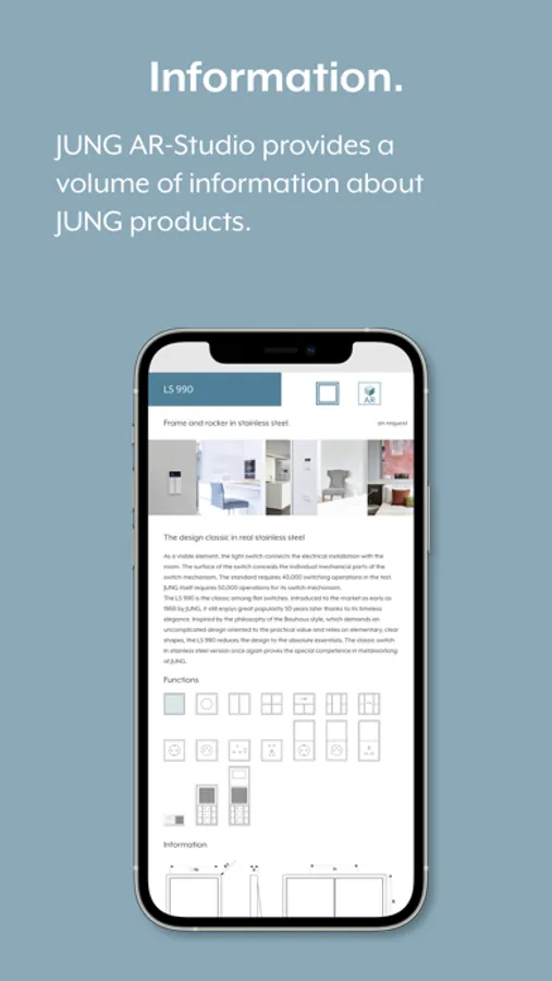 This all functions of course not only with the switches and sockets from the JUNG design range: KNX operating elements, USB charging stations, Smart Radio DAB+, spotlights and floodlights from the Plug & Light system - with the JUNG app, you can have a realistic experience of over 2,000 models from the versatile JUNG product world. AR Studio also provides valuable background knowledge and selected reference photos of the individual products.