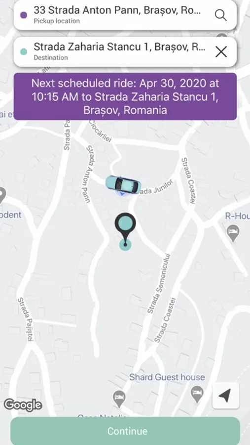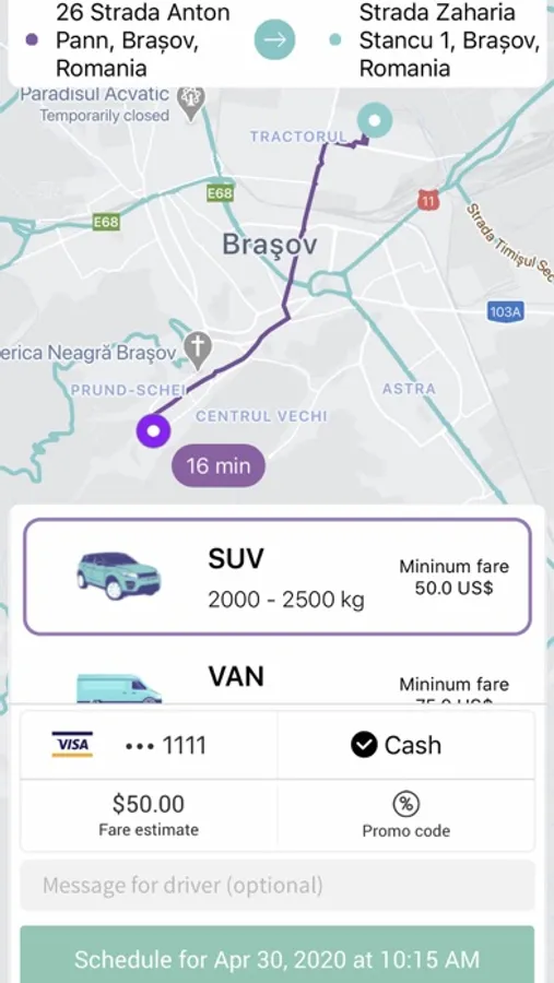 b) scheduled in the future, with details about locations, route, estimated cost and if a driver has been found or is still being searched