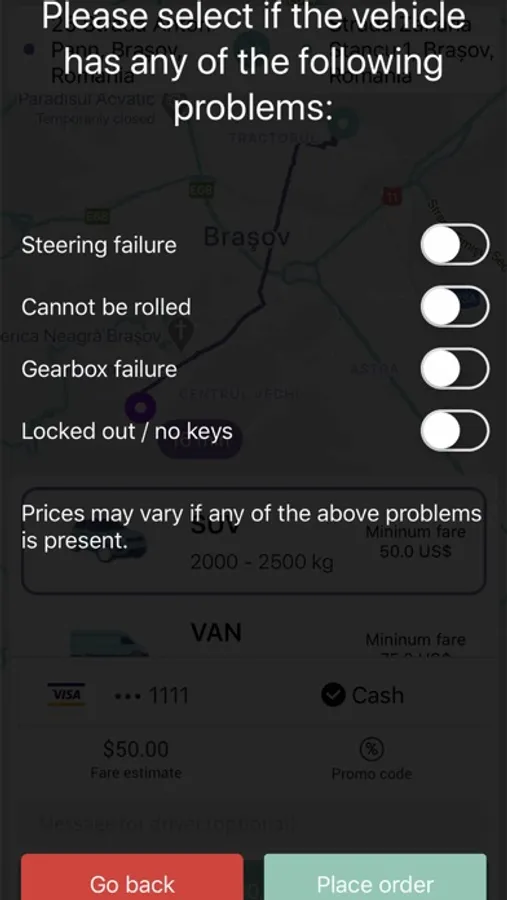- choose the type of vehicle that requires towing or car assistance: car, SUV, van, equipment