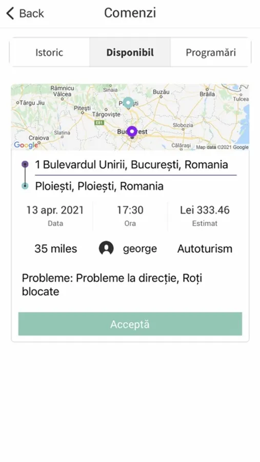 Acceptă comanda în funcție de programul tău. Odată acceptată, poți vorbi prin mesaje chat sau prin telefon direct cu clientul. Prețul transportului este actualizat în funcție de orașul din care pleci spre client.