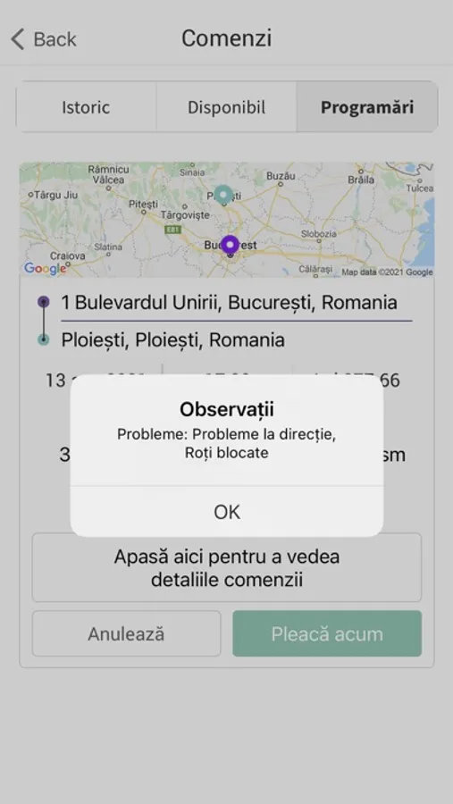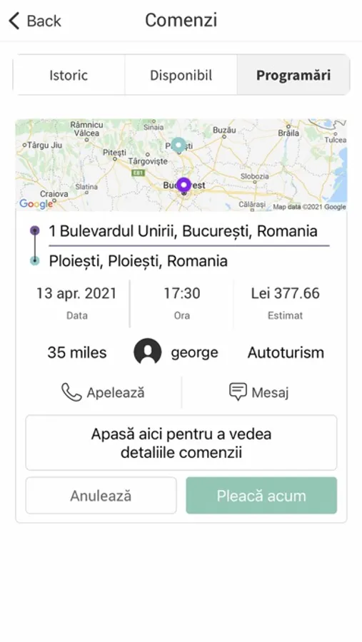 3. Pleci spre client apăsând pe "Pleacă acum" și ești comutat într-un ecran în care vezi detaliile de preluare; poți folosi aplicația ta de navigație cu adresa precompletată deja.