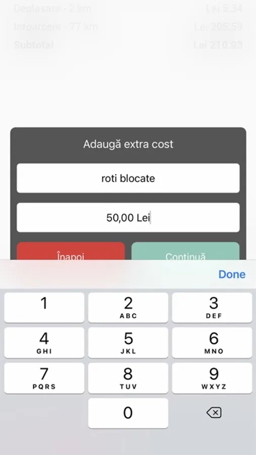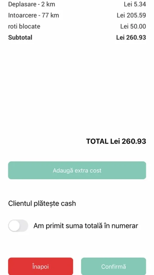 6. La descărcare, aplicația arată un subtotal pe care șoferul trebuie să îl încaseze, fie cash, fie cu cardul, care include comisionul AutoLift. În acest pas se pot adăuga costuri extra pentru diverse probleme pe care aplicația nu le-a contorizat: staționări, alte costuri de taxe de pod / drum, cu totalul actualizat instantaneu.