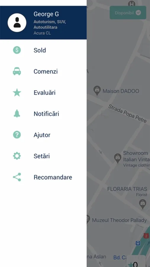 În meniul aplicației șoferul poate vedea cursele făcute, comenzile disponibile pentru acceptare sau cele acceptate deja, sold de încasări, recenzii de la clienți, distanțe parcurse etc.