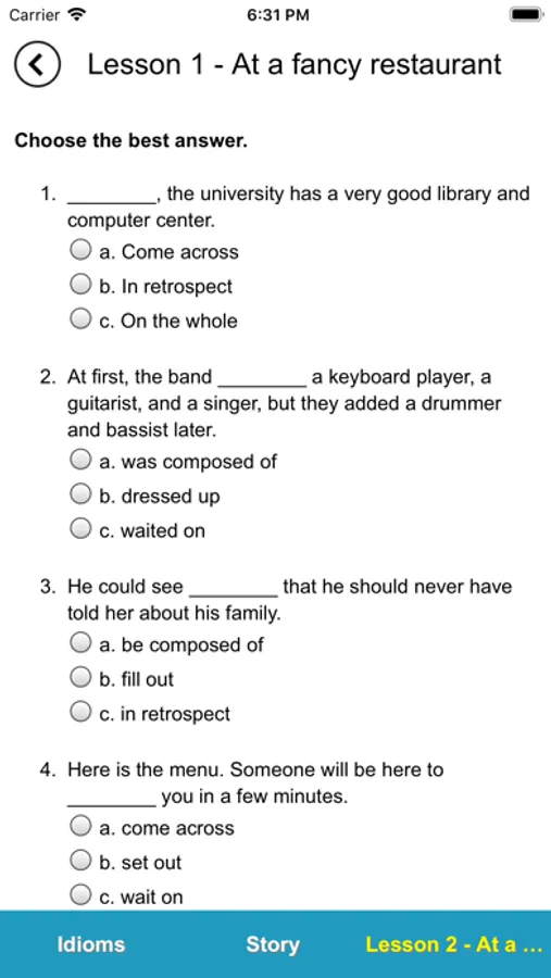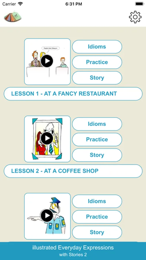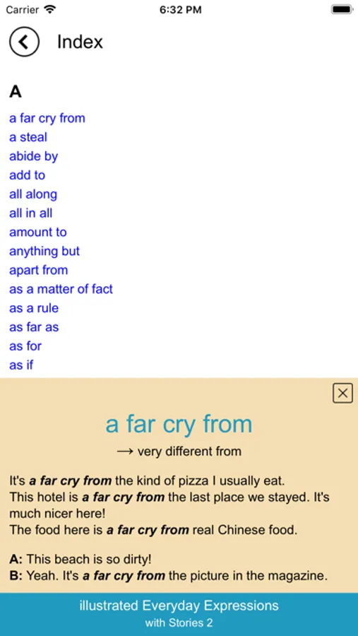 Each lesson of this book begins with a list of twenty target idioms. The idioms are arranged alphabetically throughout the book to help students reference the idioms for later use. After completing all the units in the book, students may continue to use Illustrated Everyday Expressions with Stories series as a humorous illustrated dictionary of common idioms.