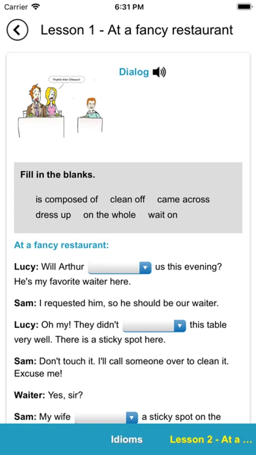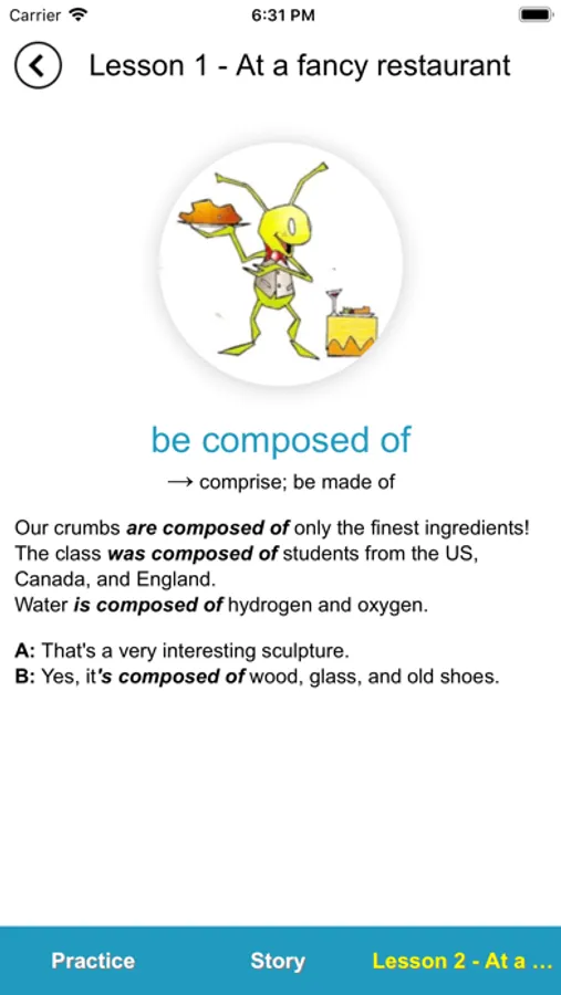 Within each lessons, target idioms are first defined for students. The definitions may explain the idiom in simple terms or use synonyms or other idioms to build a student's understanding of the meaning underlying each idiom. Each definition is then followed by sample sentences and short dialogs using the idiom in context. Finally, idioms are illustrated with humorous illustrations which can help build a memorable picture of each idiom's usage in the reader's mind.