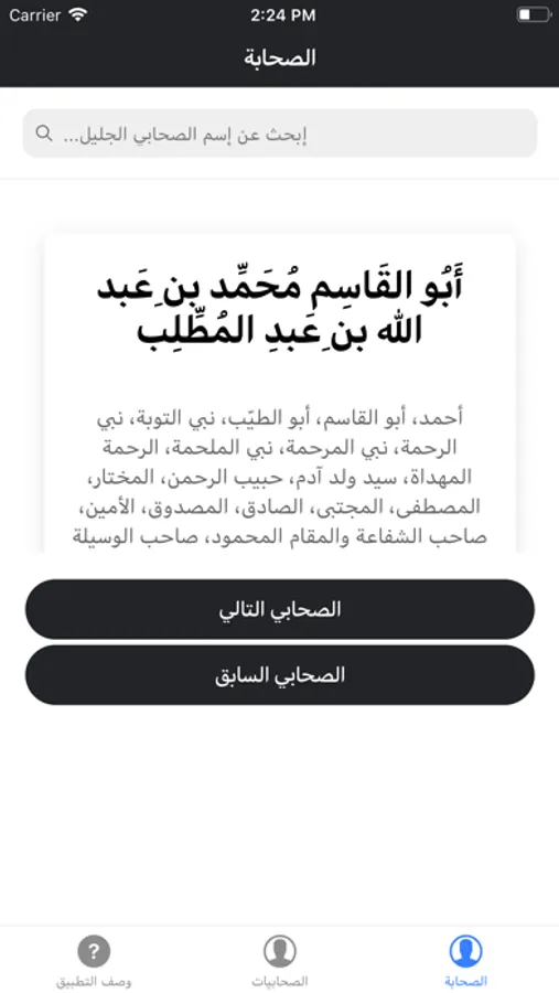 يسعى هذا التطبيق إلى التعريف بالصحابة رضوان الله عليهم. يوفر التطبيق معلومات عن حوالي 1500 صحابي و صحابية ممن كان لهم دور كبير في نقل الدعوة في صورة سيرة أشرف الخلق, نبي الله محمد عليه أزكى الصلوات.
