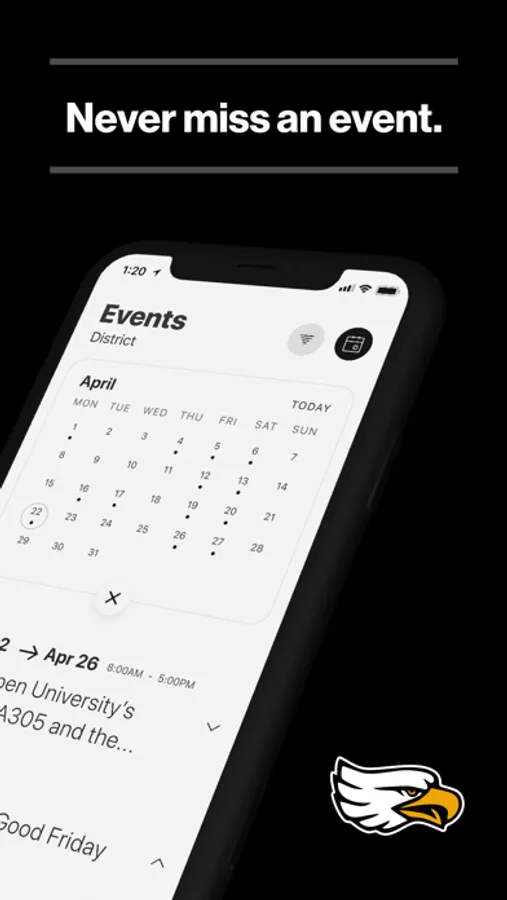 The event section shows a list of events throughout the district. Users can add an event to their calendar to share the event with friends and family with one tap.