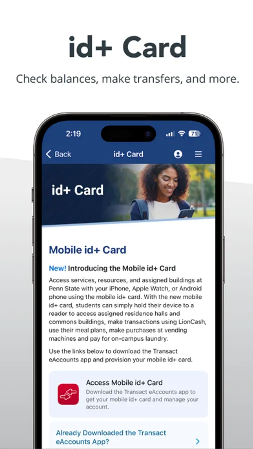 Access Penn State Mobile id+ Card, view LionCash and meal plan balances, review transactions, deactivate card, deposit LionCash, and update campus meal plan.
