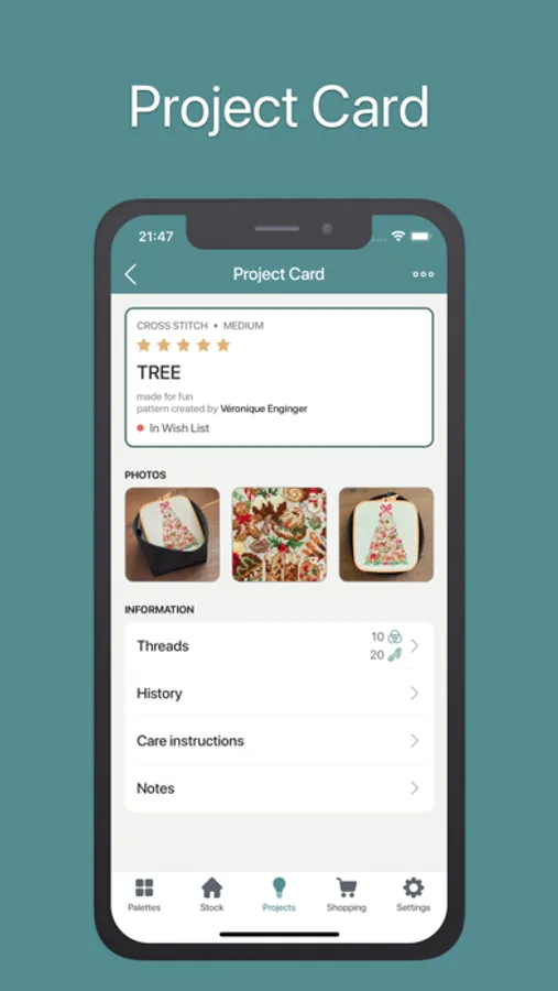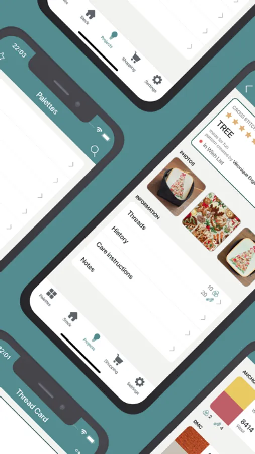 • create projects with threads (cross-stitch, satin stitch, knitting and many others) - to facilitate preparation for projects (threads that are not enough in stock are automatically added to the shopping list for unfinished projects);