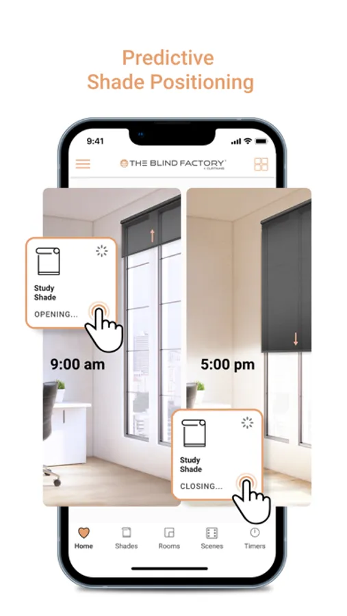 The Blind Factory hub and App has been re-designed to embrace the architecture of a home and provide effortless control of motorized shades. Easily operate or Personalize the daily routine of shades; organize them by room, grouping them by scenes and automating them with timers. Unlock the convenience of smart shade operation, with the Blind Factory app Version 3.0.