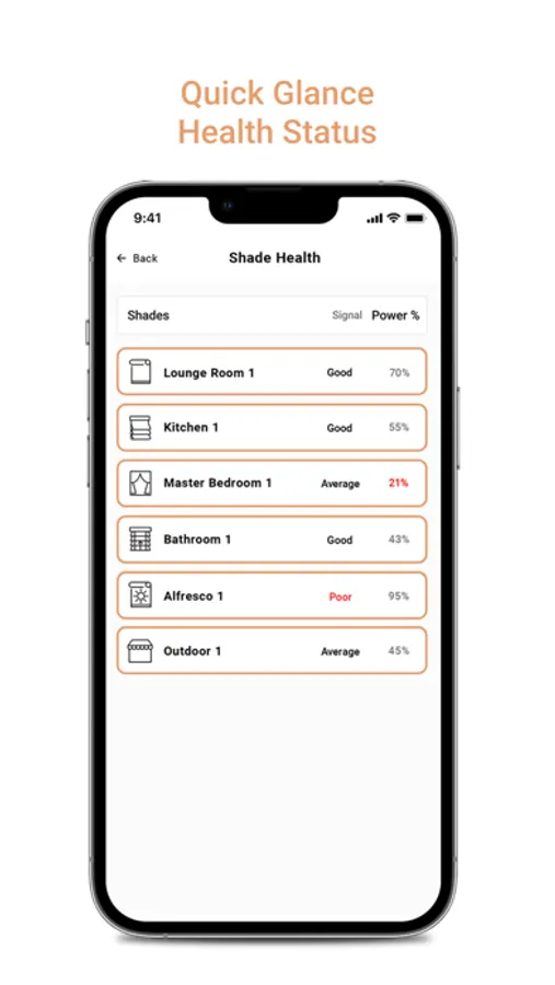 Quickly view the Health Status of all your shades. A summary screen displays the battery levels of all your shades along with signal strength indicators, prompting necessary action to either charge your motors or troubleshoot connections.