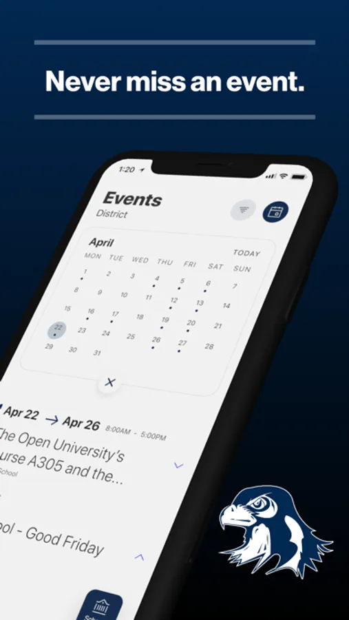 The event section shows a list of events throughout the district. Users can add an event to their calendar to share the event with friends and family with one tap.