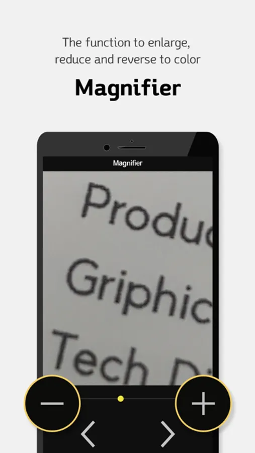 Magnifying glass function - Using the zoom function of the camera, it enlarges or reduces an object or text or inverts the color.